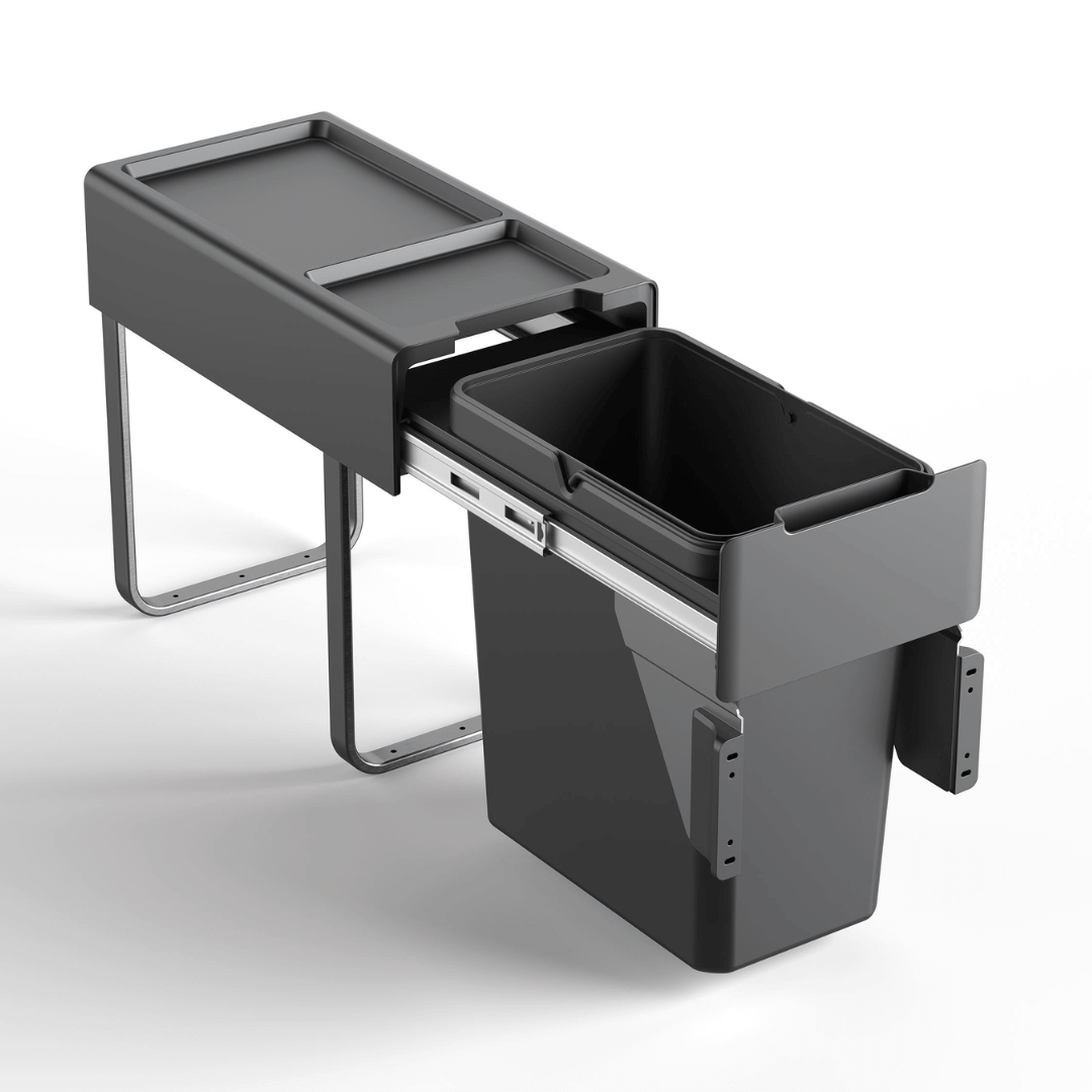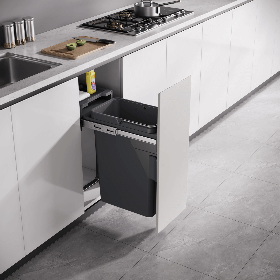 Papelera de montaje lateral para muebles, diseñada con alta capacidad y equipada con rieles de extensión. También incluye una tapa fija para evitar el máximo contacto con la basurera y los residuos depositados allí.