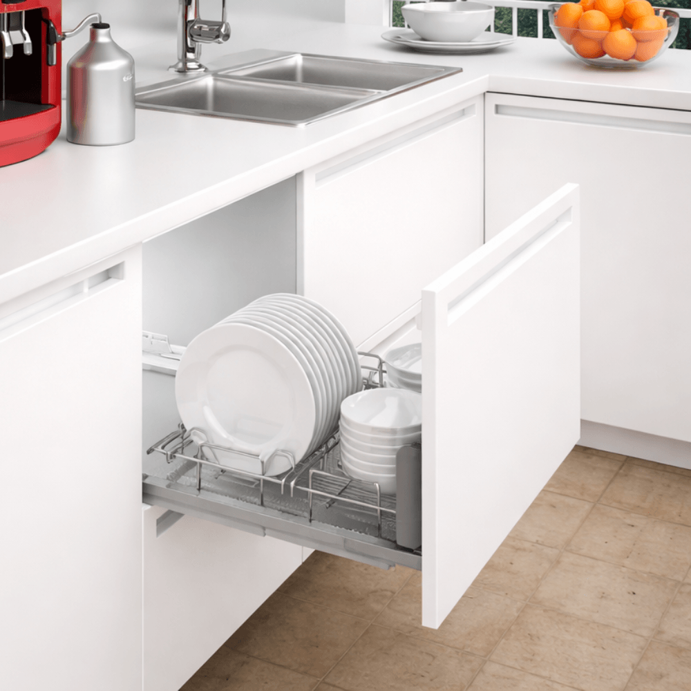 Canasta cromada con correderas de extensión con cierre suave, con escurridor de plástico y porta platos con opción para fijar el frente de cajón de acuerdo a la necesidad y espacio. Facilita la organización de platos.