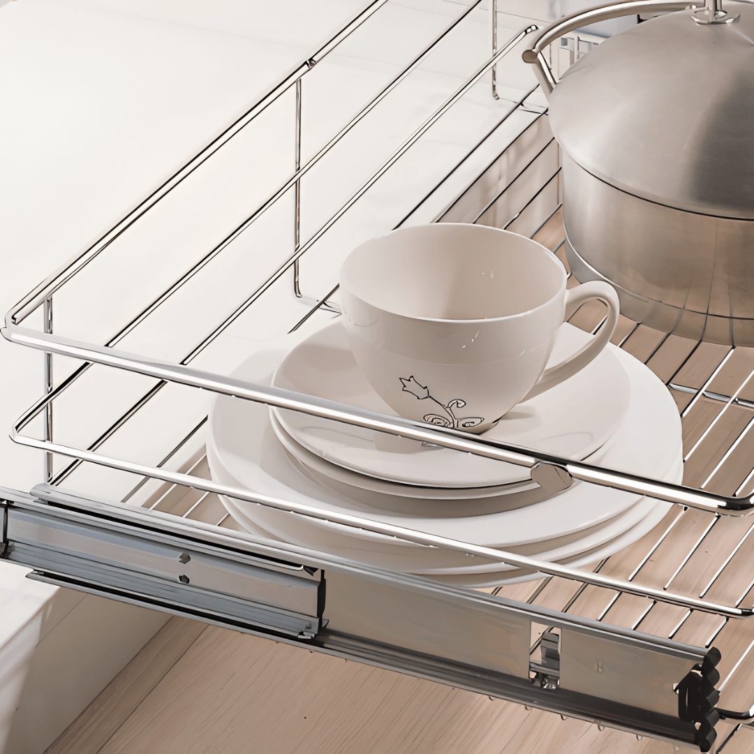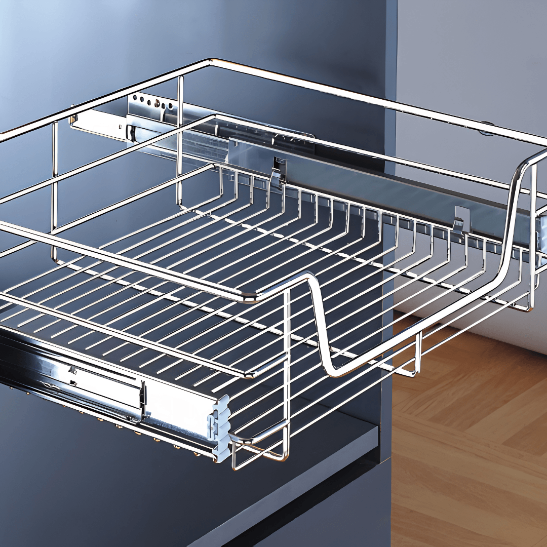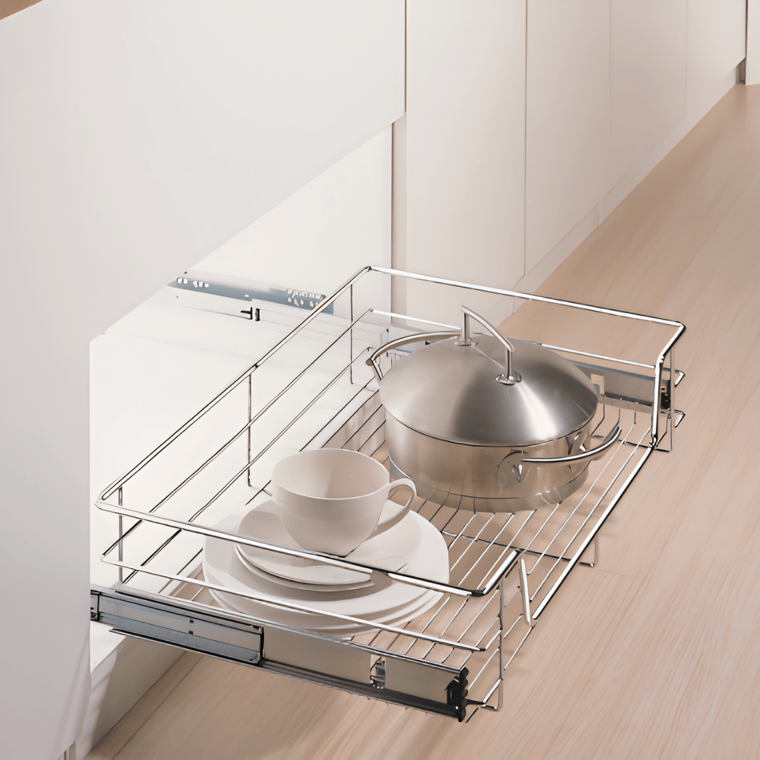 Canasta multipropósito 4 lados con riel de extensión y fijación a los costados del mueble. Incluye dilatación para la bisagra con opción para fijar el frente de cajón o puerta de acuerdo a la necesidad y espacio.