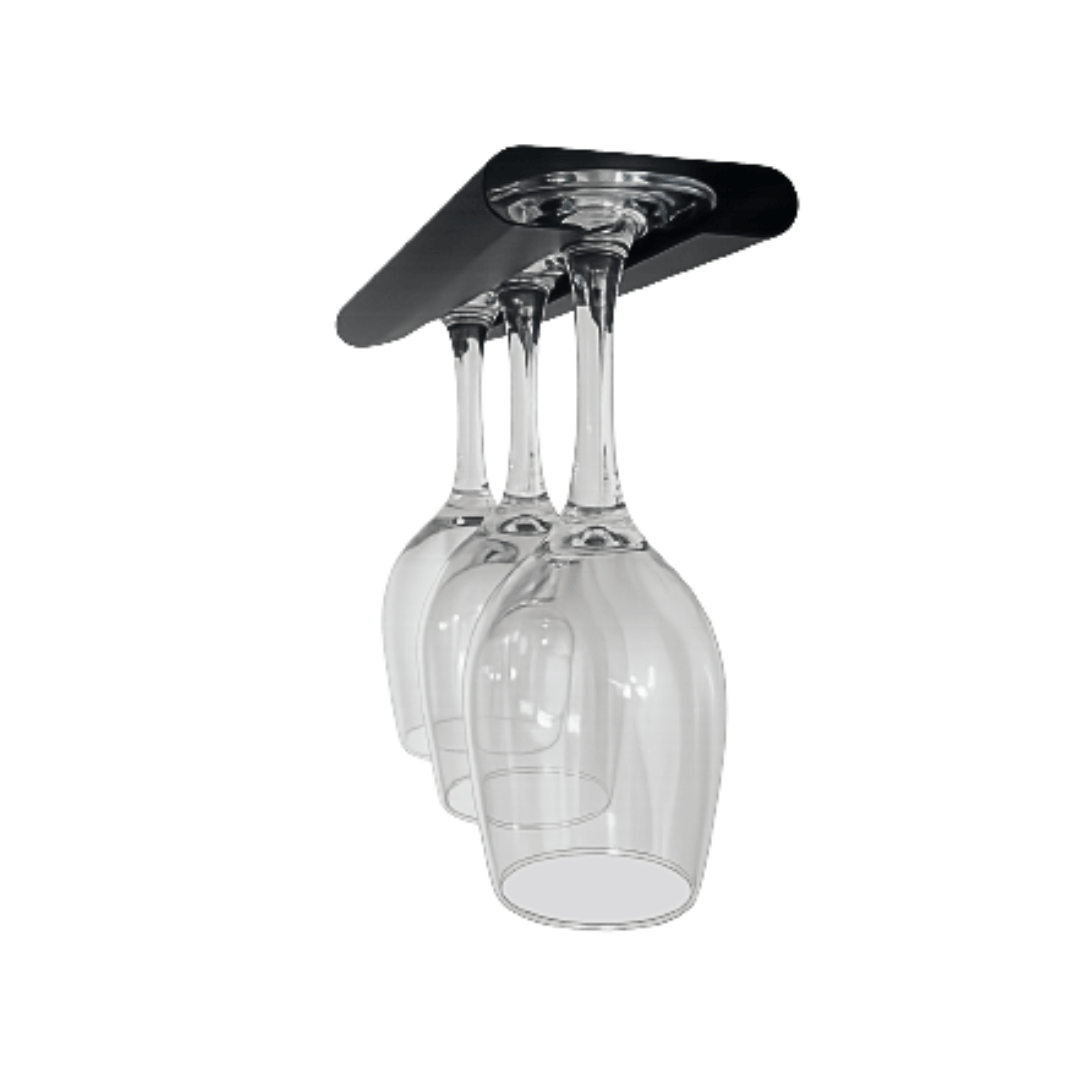 Soporte de copas para vino QUALITA de anclaje superior de una fila con capacidad para 3 copas el cual organiza tus elementos debajo de tus muebles gracias a su instalación. Su diseño añade un toque de elegancia a la decoración de tu cocina o bar además su estructura es de alta calidad.
