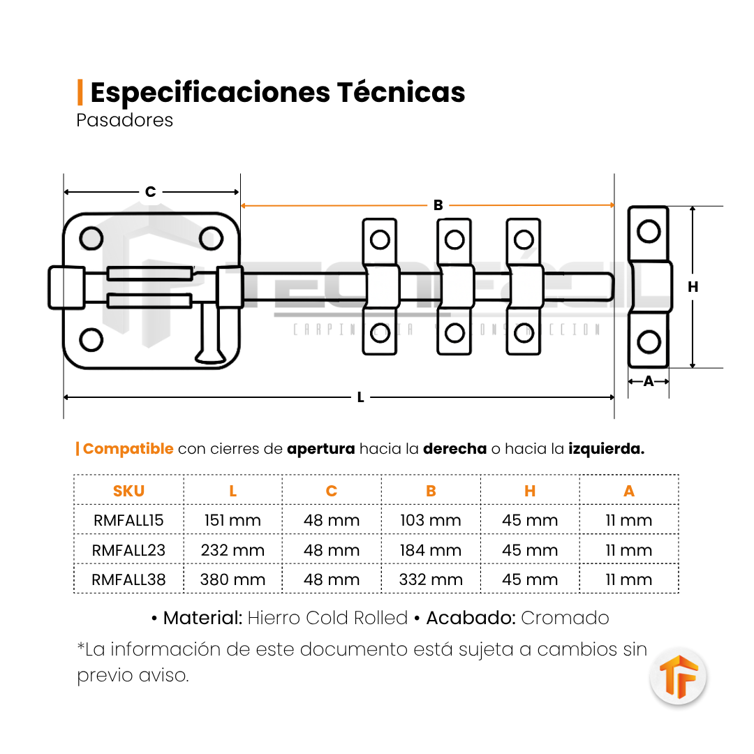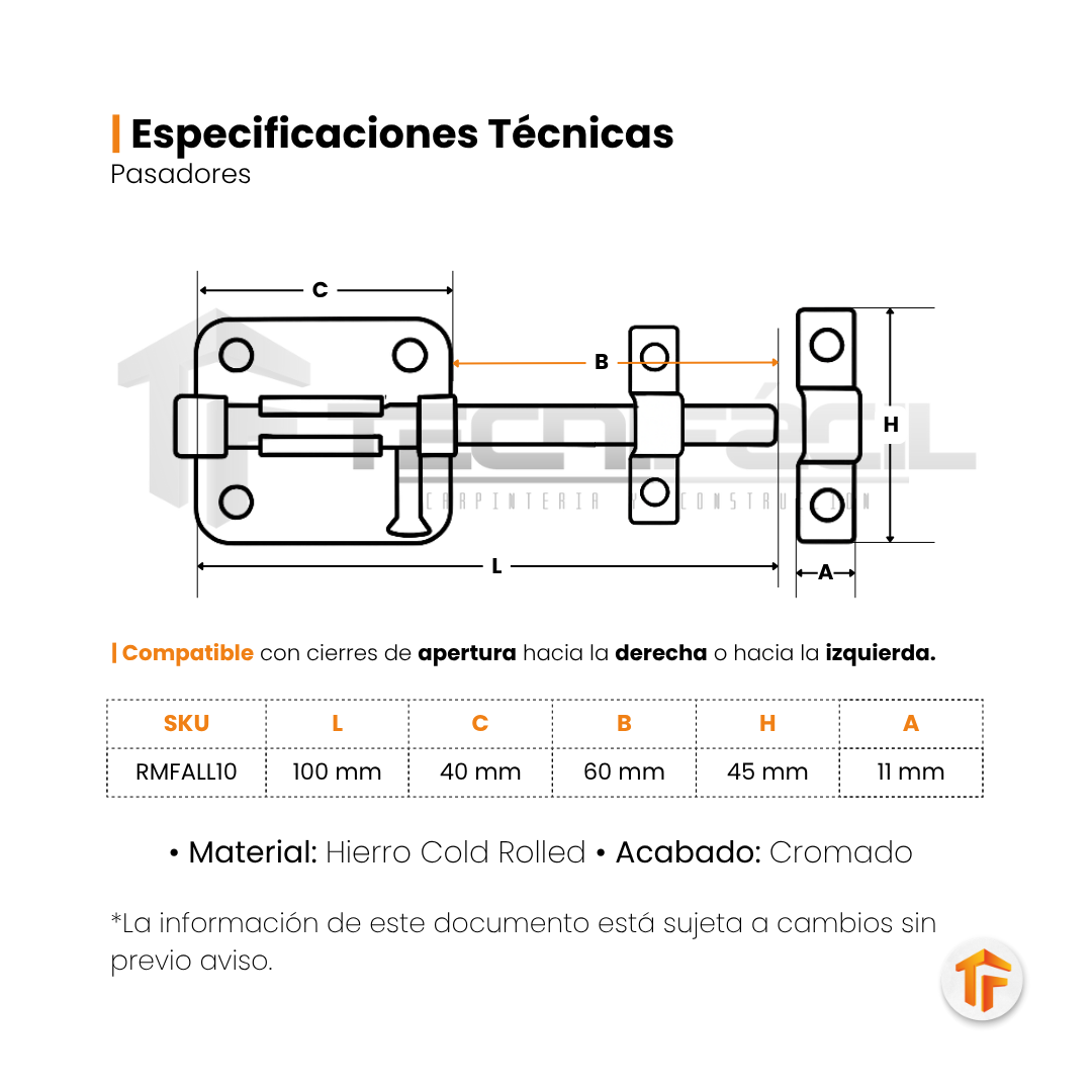 Pasador rectangular es un resistente mecanismo de cierre auxiliar, ideal para instalar sobre puertas abatibles de madera. Ofrece un nivel de seguridad adicional, complementando cerraduras principales o asegurando puertas interiores de forma práctica y confiable. Su diseño garantiza durabilidad, mientras que su acabado aporta un toque moderno y elegante a cualquier espacio.