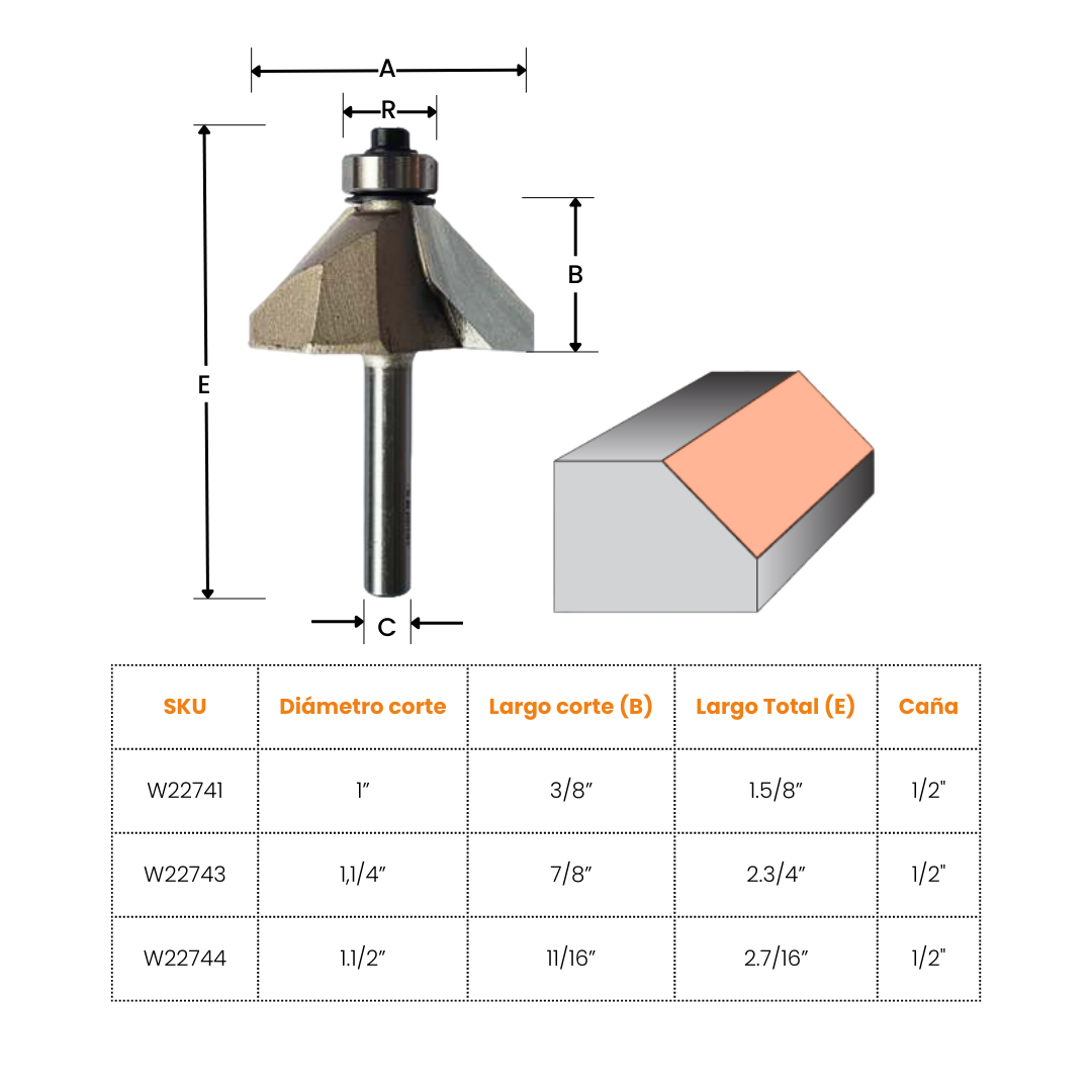 La fresa biseladora a 45° con rodamiento de ½” ha sido diseñada para crear chaflanes precisos y uniformes en bordes de madera, MDF, contrachapado y otros materiales de carpintería. Su rodamiento sirve como guía para seguir bordes o plantillas sin desvíos, permitiendo cortes limpios y consistentes.