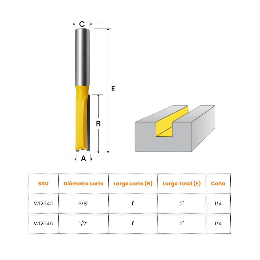 Fresa de tres filos para ruteadora fabricada en tungsteno de alta resistencia, diseñada para trabajos de uso profesional. Ideal para cortes rectos con una cuchilla con espigo de 1/4.