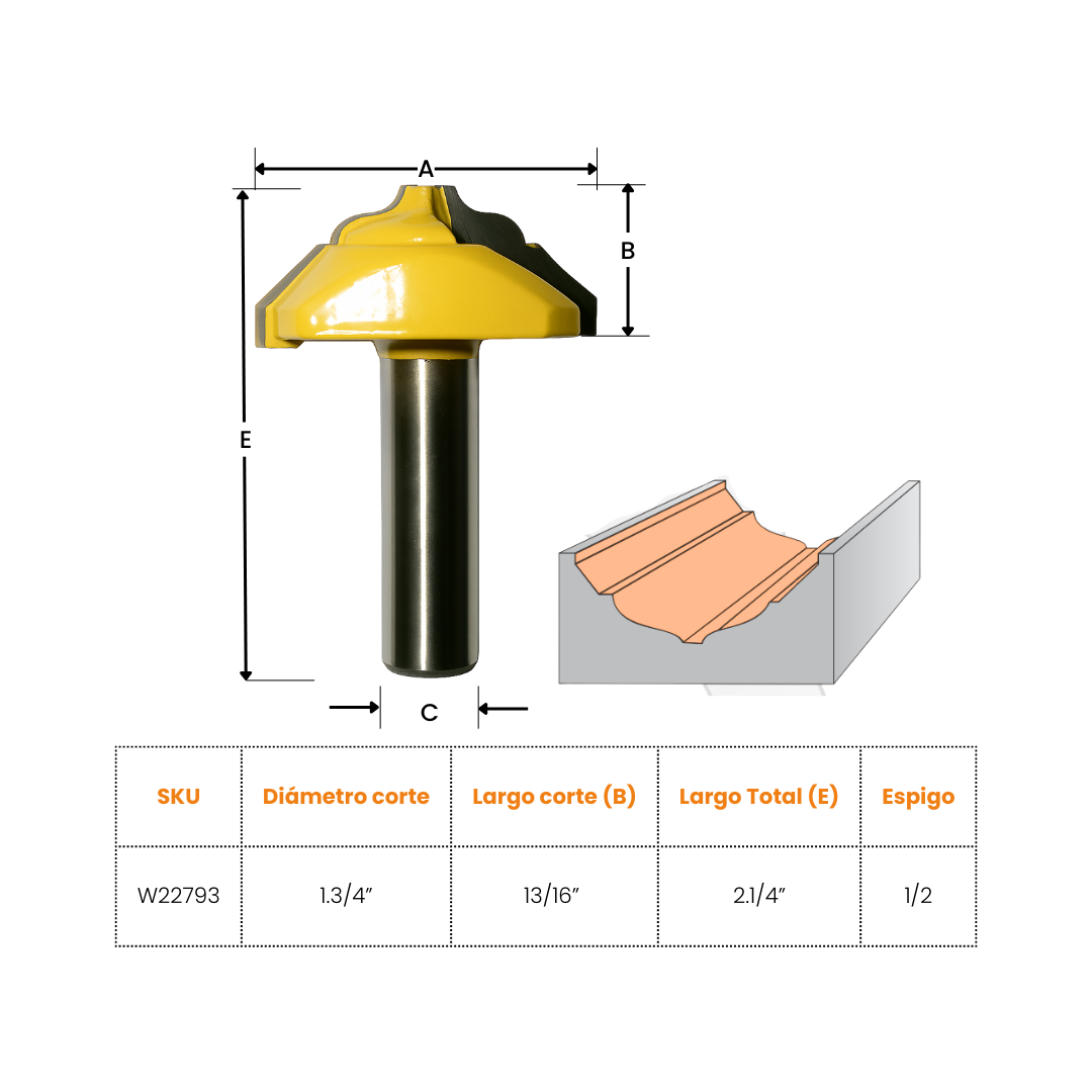 Fresa diseñada para crear perfiles decorativos de corte amplio con acabado ondulado clásico, ideal para realzar bordes y dar un estilo elegante a tus proyectos de carpintería. Su espigo de 1/2” asegura mayor estabilidad durante el fresado, permitiendo cortes más firmes, suaves y precisos.