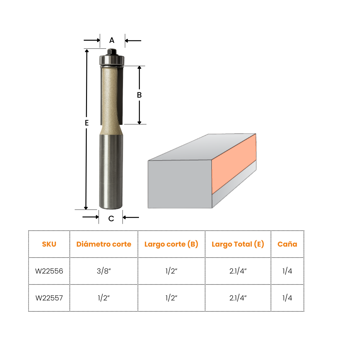 Fresa de Rebordear diseñada especialmente para el trabajo en superficies laminadas, esta fresa garantiza un acabado uniforme, preciso y libre de imperfecciones en cantos y bordes. Sus dos rodamientos de guía permiten un mejor control y estabilidad durante el corte, reduciendo vibraciones y asegurando un rebordeado limpio incluso en curvas o superficies irregulares.