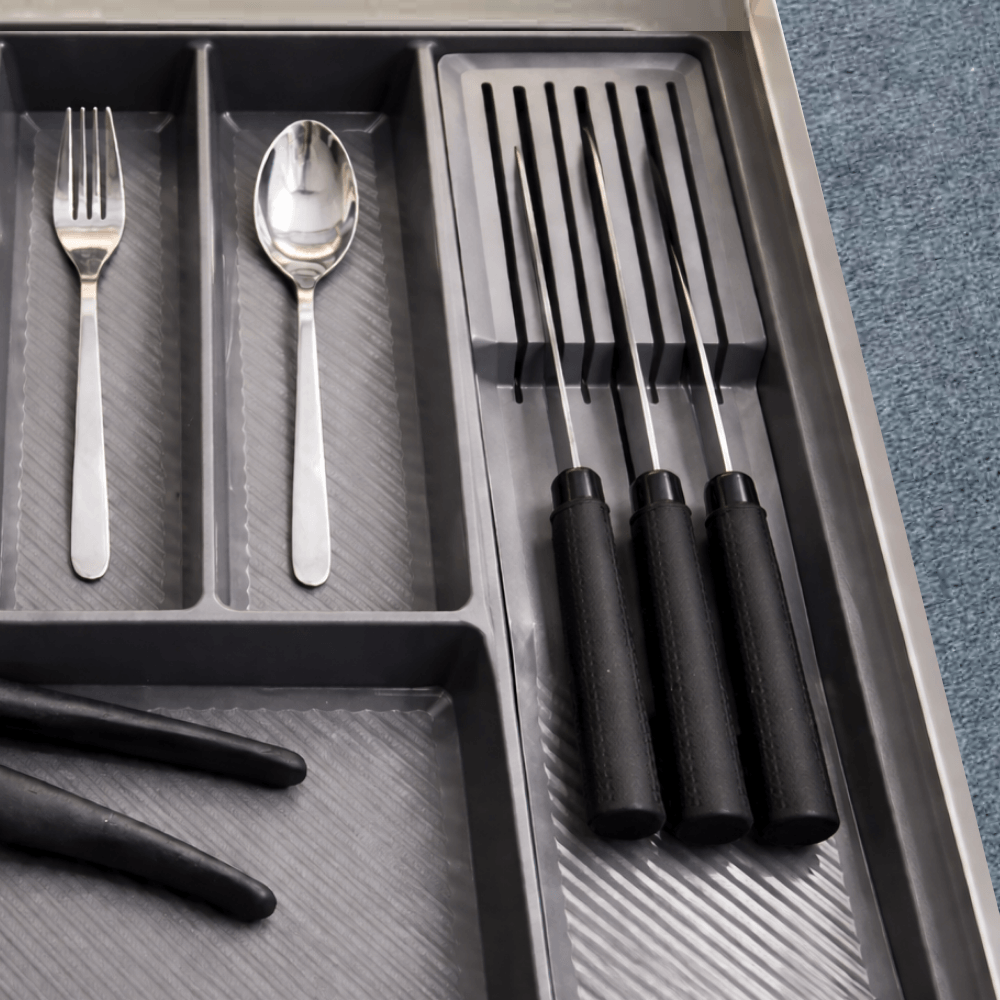 Organiza tus cuchillos de forma segura y práctica. Este accesorio mantiene todo en su lugar, optimizando espacio y cuidando tus utensilios. Ideal para cajones o superficies de cocina.