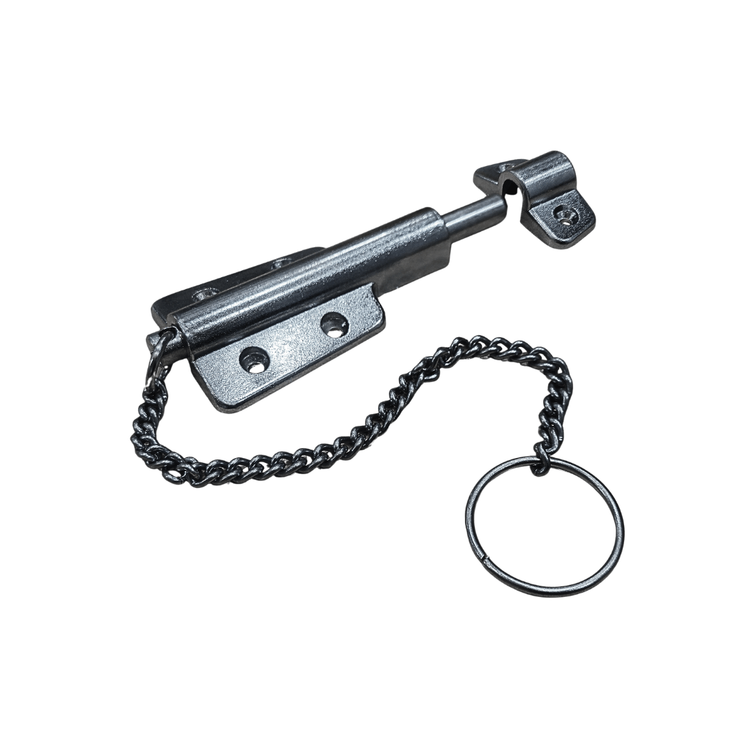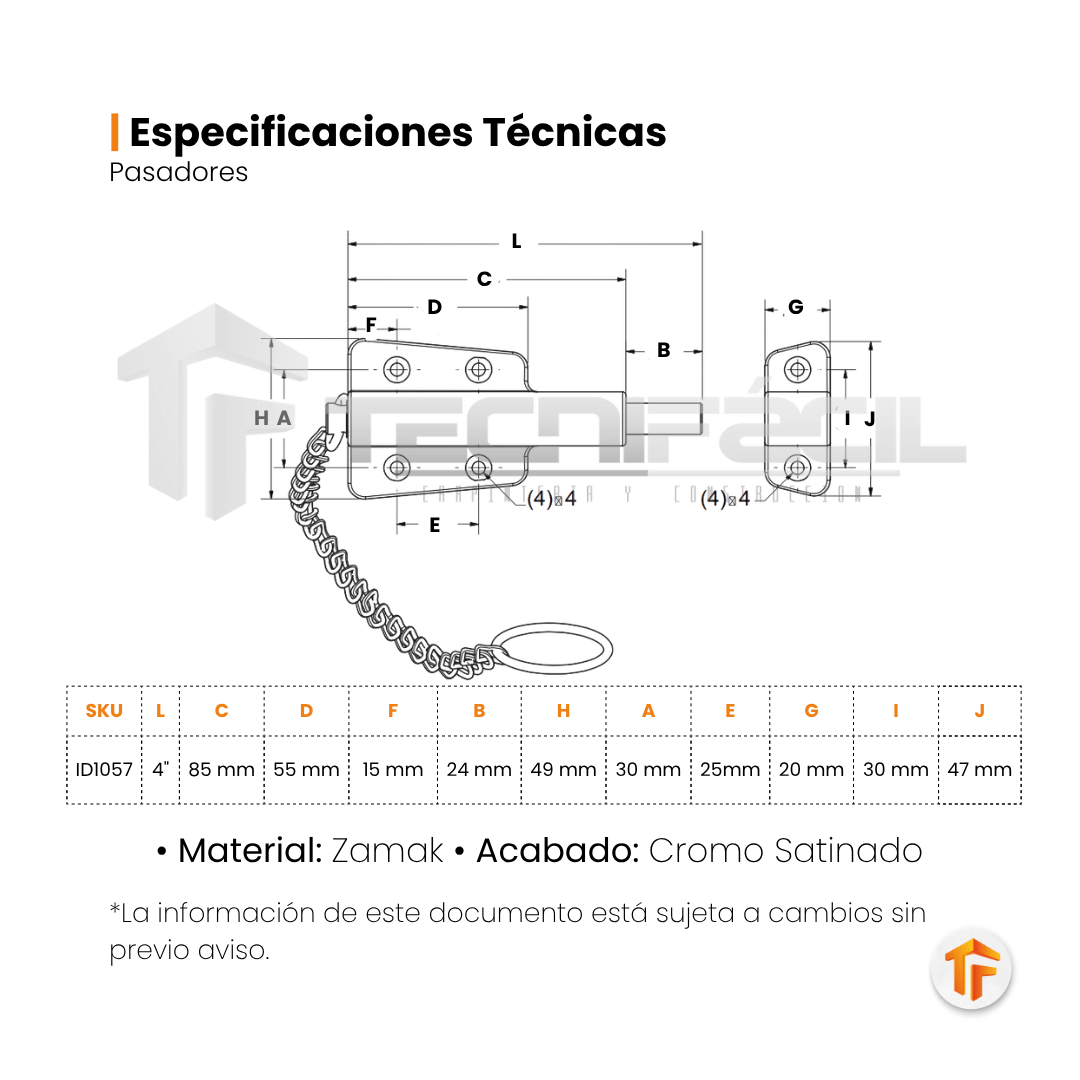 Pasador de cadena es un resistente mecanismo de cierre auxiliar, ideal para instalar sobre puertas. Ofrece un nivel de seguridad adicional, complementando cerraduras principales o asegurando puertas interiores de forma práctica y confiable. Su diseño garantiza durabilidad, mientras que su acabado aporta un toque moderno y elegante a cualquier espacio.