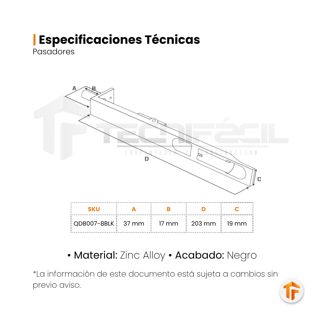 Pasador de incrustar es un resistente mecanismo de cierre auxiliar, ideal para instalar sobre puertas. Ofrece un nivel de seguridad adicional, complementando cerraduras principales o asegurando puertas interiores de forma práctica y confiable. Su diseño garantiza durabilidad, mientras que su acabado aporta un toque moderno y elegante a cualquier espacio.