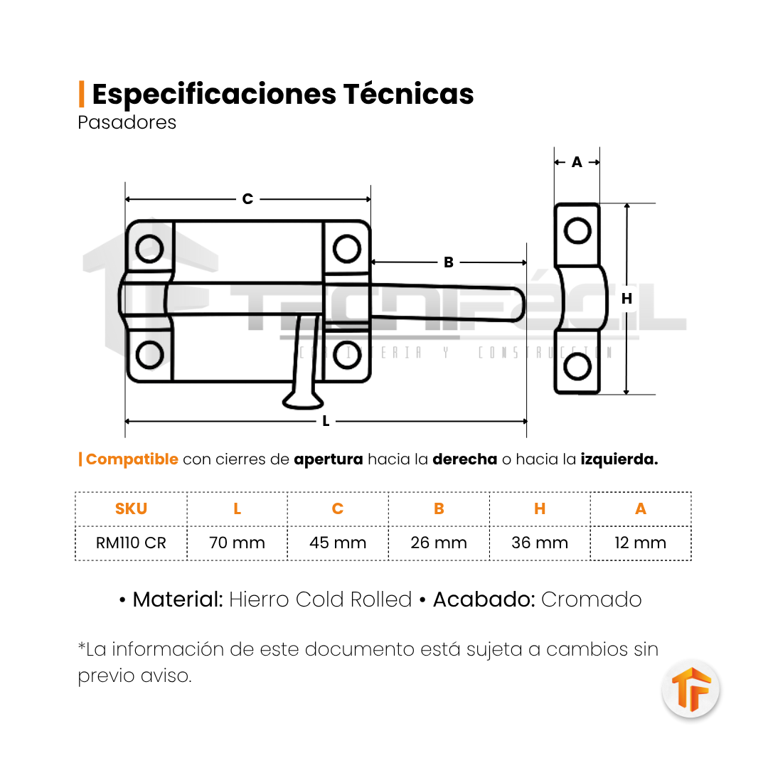 Pasador rectangular es un resistente mecanismo de cierre auxiliar, ideal para instalar sobre puertas abatibles de madera. Ofrece un nivel de seguridad adicional, complementando cerraduras principales o asegurando puertas interiores de forma práctica y confiable. Su diseño garantiza durabilidad, mientras que su acabado aporta un toque moderno y elegante a cualquier espacio.