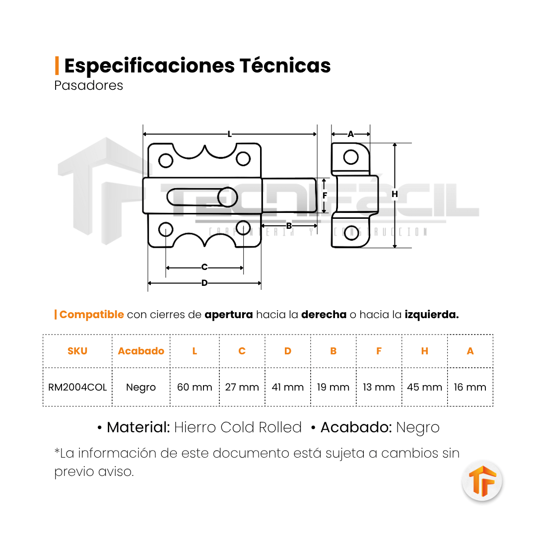 Pasador colonial es un resistente mecanismo de cierre auxiliar, ideal para instalar sobre puertas abatibles de madera. Ofrece un nivel de seguridad adicional, complementando cerraduras principales o asegurando puertas interiores de forma práctica y confiable. Su diseño garantiza durabilidad, mientras que su acabado aporta un toque moderno y elegante a cualquier espacio.