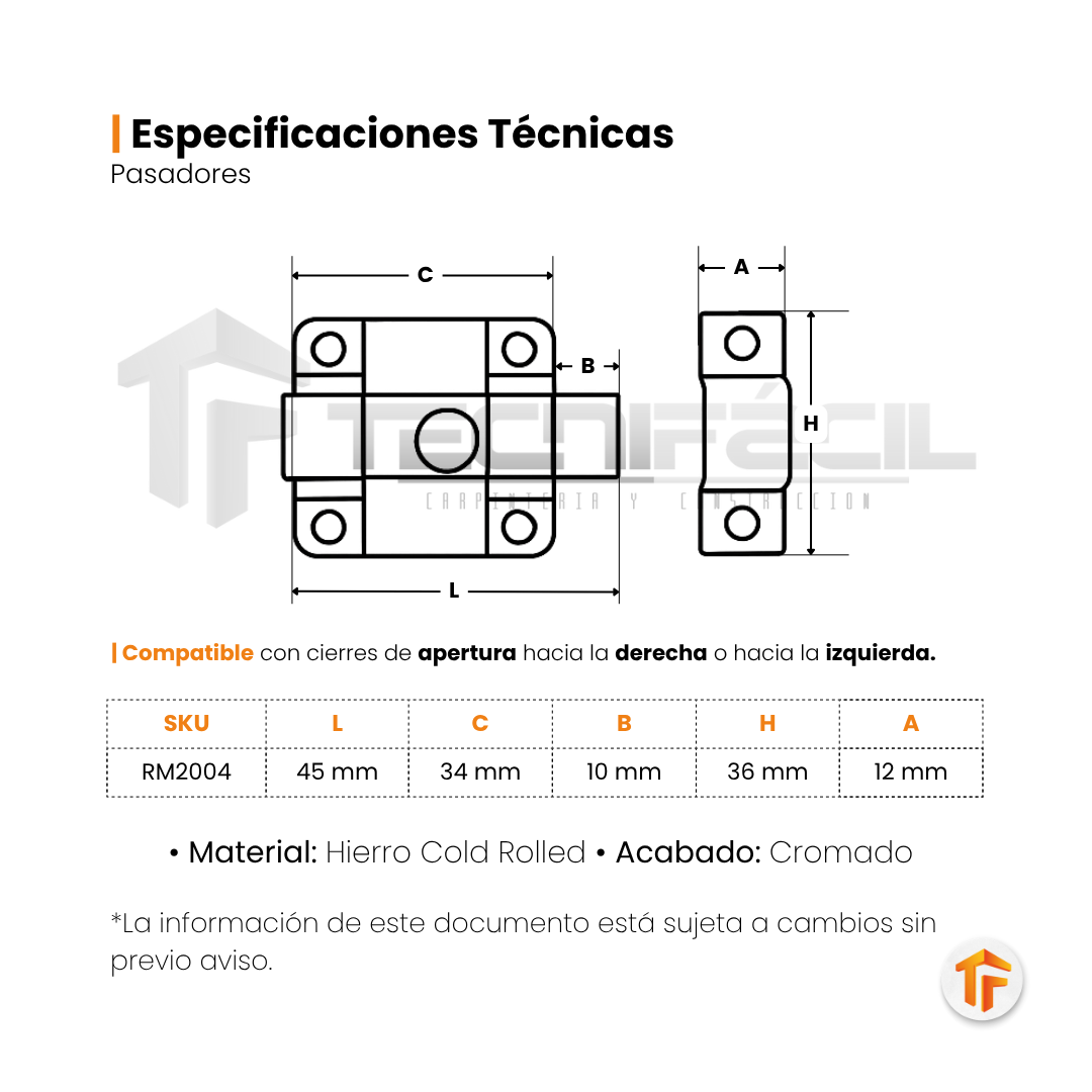 Pasador rectangular es un resistente mecanismo de cierre auxiliar, ideal para instalar sobre puertas abatibles de madera. Ofrece un nivel de seguridad adicional, complementando cerraduras principales o asegurando puertas interiores de forma práctica y confiable. Su diseño garantiza durabilidad, mientras que su acabado aporta un toque moderno y elegante a cualquier espacio.