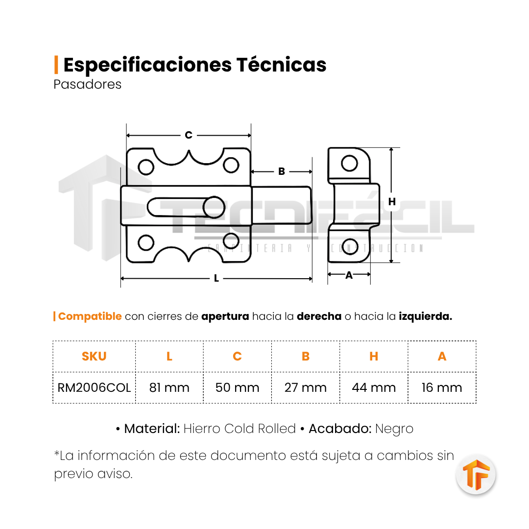 Pasador colonial es un resistente mecanismo de cierre auxiliar, ideal para instalar sobre puertas abatibles de madera. Ofrece un nivel de seguridad adicional, complementando cerraduras principales o asegurando puertas interiores de forma práctica y confiable. Su diseño garantiza durabilidad, mientras que su acabado aporta un toque moderno y elegante a cualquier espacio.