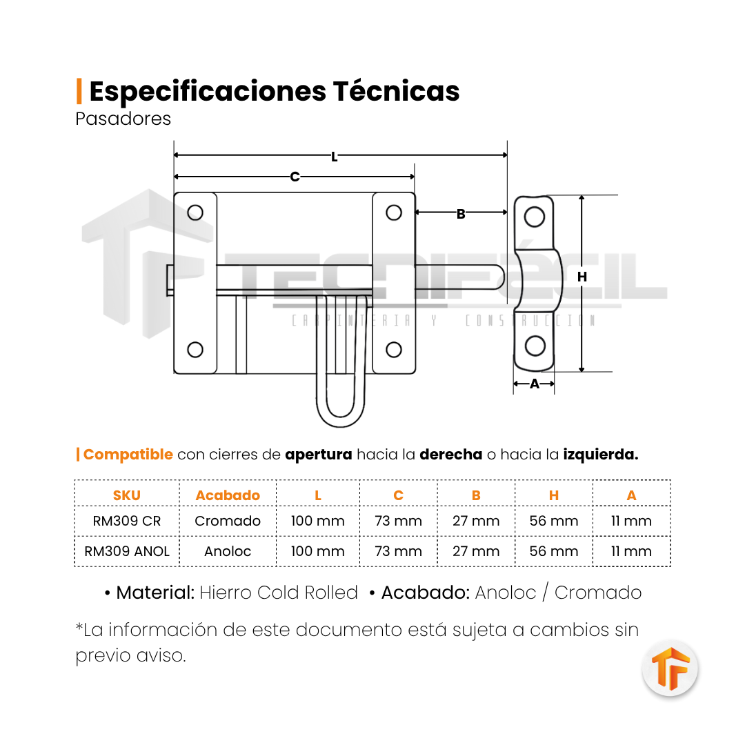 Portacandado rectangular es un resistente mecanismo de cierre auxiliar, ideal para instalar sobre puertas abatibles de madera. Ofrece un nivel de seguridad adicional, complementando cerraduras principales o asegurando puertas interiores de forma práctica y confiable. Su diseño garantiza durabilidad, mientras que su acabado aporta un toque moderno y elegante a cualquier espacio.