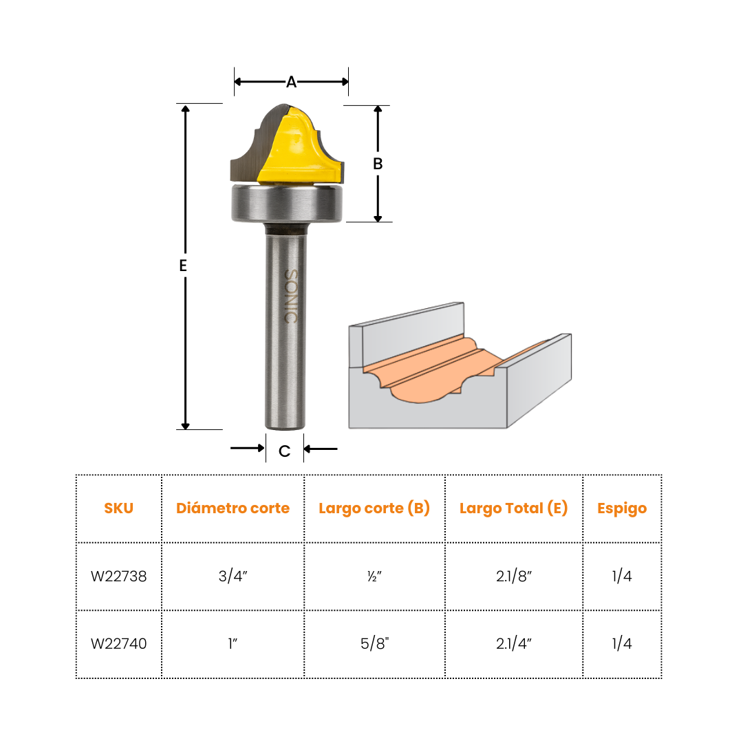 Fresa versátil para cortes completos y bordes decorativos en madera, MDF y tableros. Equipada con rodamiento superior de ½” que facilita el uso con plantillas y asegura cortes precisos. Fabricada en carburo de tungsteno, ofrece durabilidad y acabados profesionales.